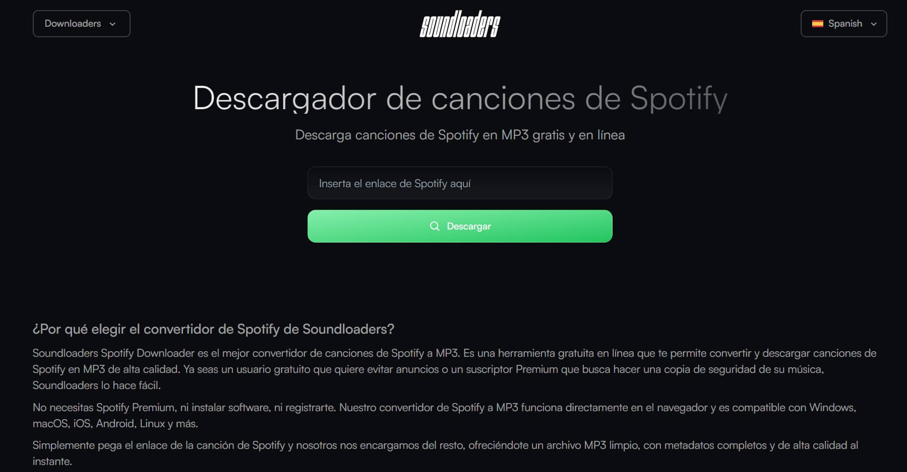 SoundLoaders es otra herramienta online sencilla que permite descargar canciones de Spotify y otros servicios de streaming directamente desde el navegador.