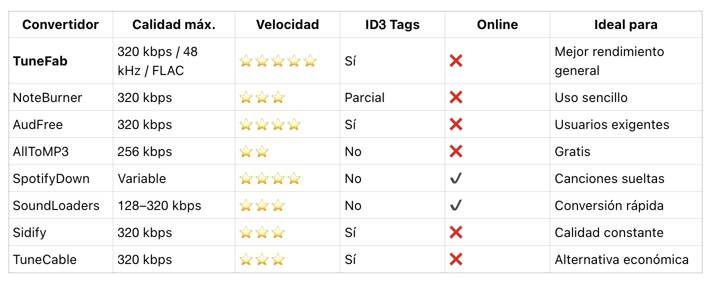 El mercado de convertidores de Spotify a MP3 está lleno de opciones, pero tras probar las herramientas más populares vimos que TuneFab Spotify Music Converter ofrece la mejor combinación de velocidad, calidad de audio, estabilidad y funciones avanzadas.