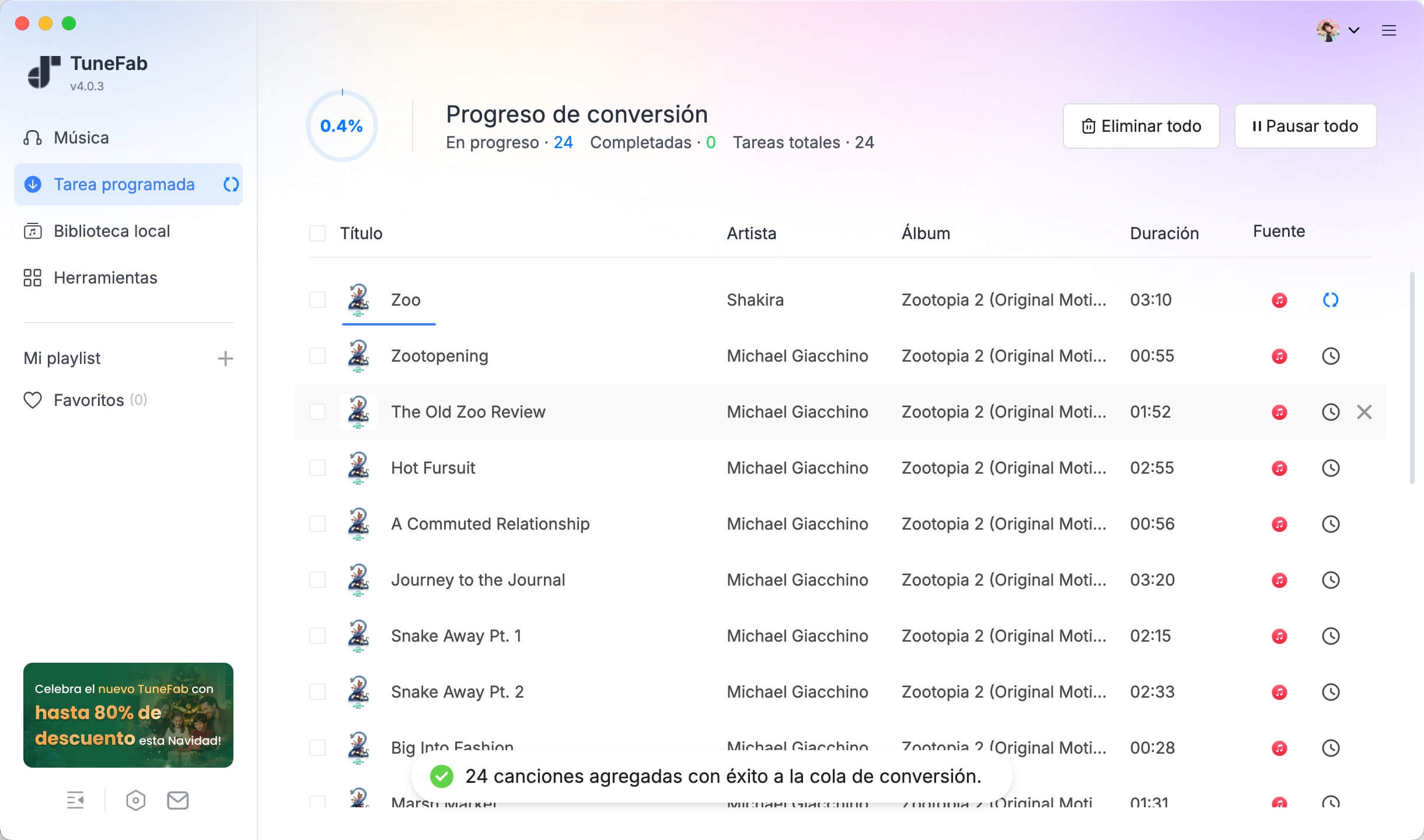 Haz clic en el botón “Convertir” y espera unos minutos. TuneFab guardará automáticamente los archivos en tu disco local, manteniendo las carátulas, títulos, artistas y demás datos organizados.